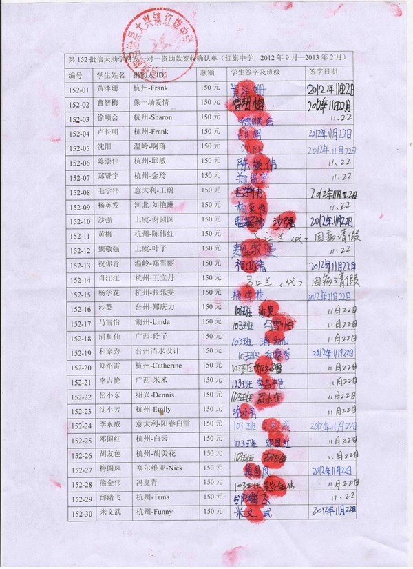 我们将收取全部六个学期的资助款,每学期初汇给委托老师浦理智老师,由浦理智老师按学期组织向受助学生发放资助费,最后我们统一在网上公布受助生领款签收单。