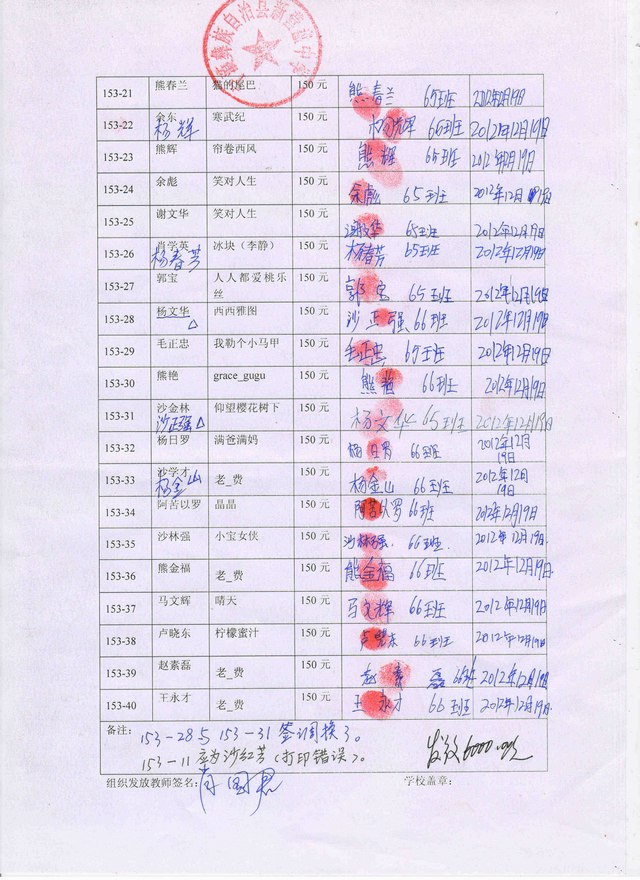 初一年级学生,编号153-01----153-40:资助款为900元/人,2012年9月----2015年7月,共六个学期,一个学期150元。
