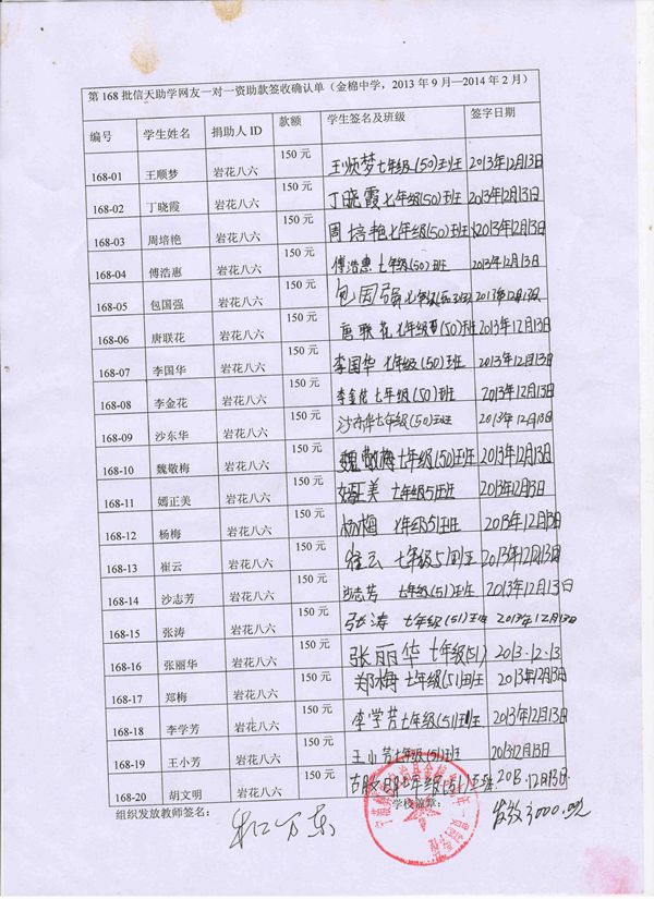 初一年级学生,编号168-01----168-20:资助款为900元/人,2013年9月----2016年7月,共六个学期,一个学期150元。