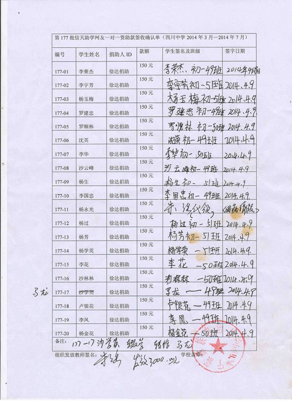 初一年级学生,编号177-01----177-20:资助款为900元/人,2013年11月----2016年7月,共六个学期,一个学期150元。