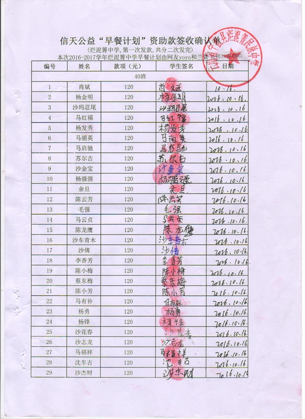 烂泥箐中学,2016-2017年早餐计划第一次发款签收单