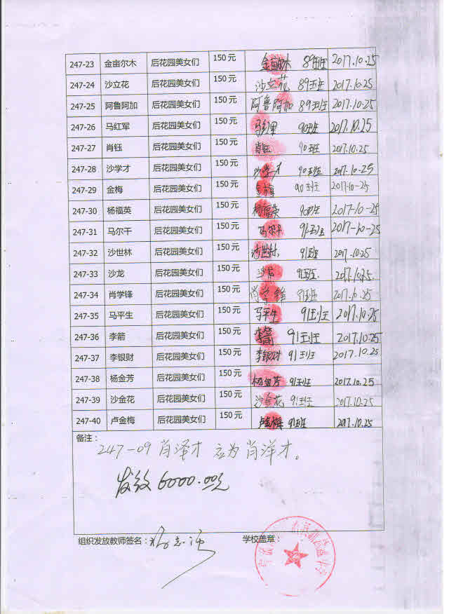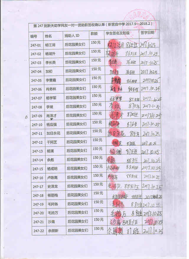 第247批新营盘中学(2017年9月到2018年2月)受助学生签收单