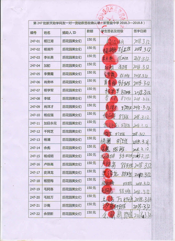 第247批新营盘中学(2018年3月到2018年8月)受助学生签收单