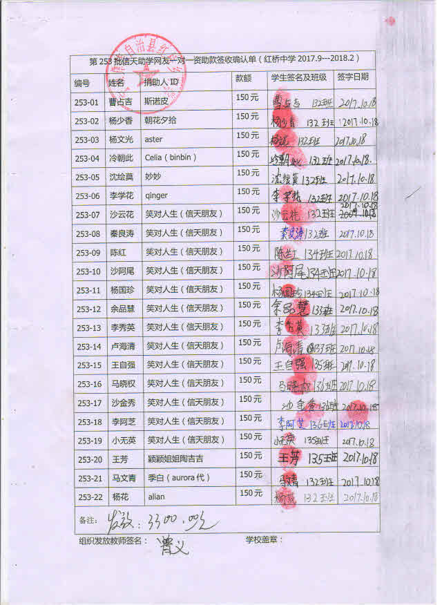 第253批红桥中学(2017年9月-2018年2月)受助生签收单