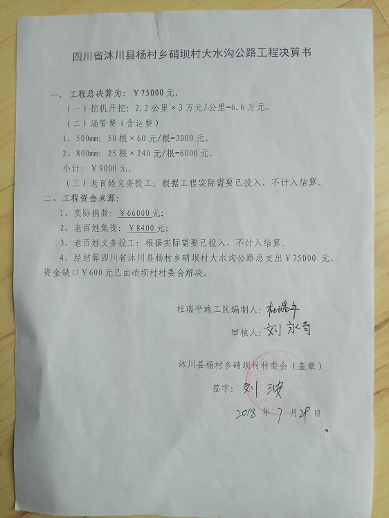 (5)修路预算分好几部分,有挖掘机、涵管、炸药爆破(山崖需要爆破)、堡坎、村民义务工、征地等。修路,我们不全包,我们出一大部分钱:挖掘费用、山崖爆破等。村民出义务工、涵管、征地费、村民小额集资。