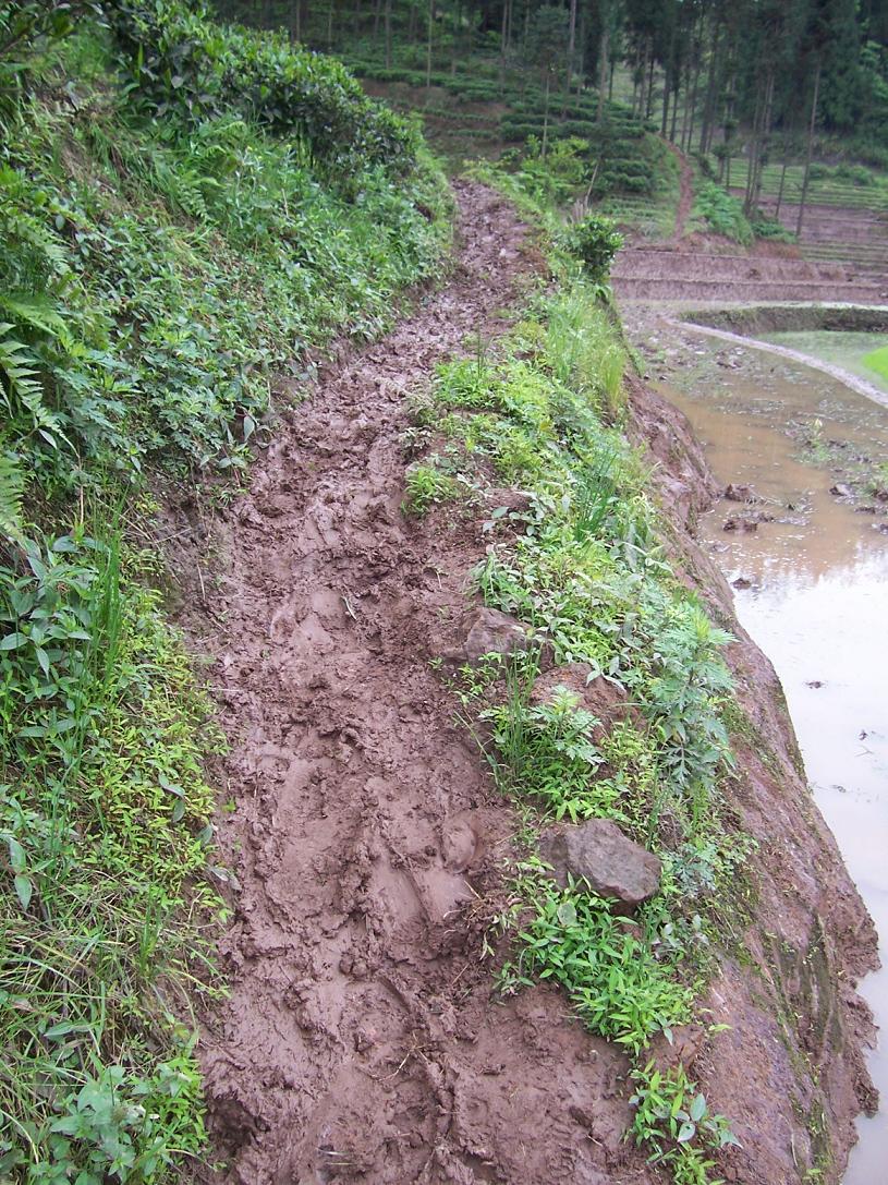 自家秧田里跑水了,挖些泥巴补一下……