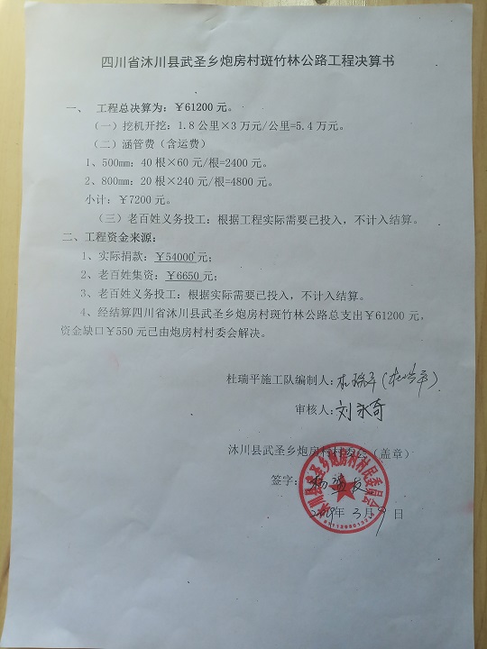(5)修路预算分好几部分,有挖掘机、涵管、炸药爆破(山崖需要爆破)、堡坎、村民义务工、征地等。修路,我们不全包,我们出一大部分钱:挖掘费用、山崖爆破等。村民出义务工、涵管、征地费、村民小额集资。