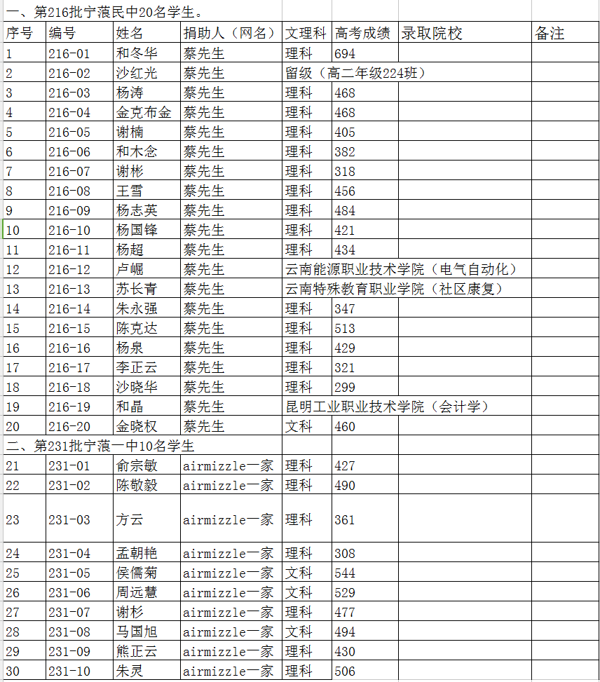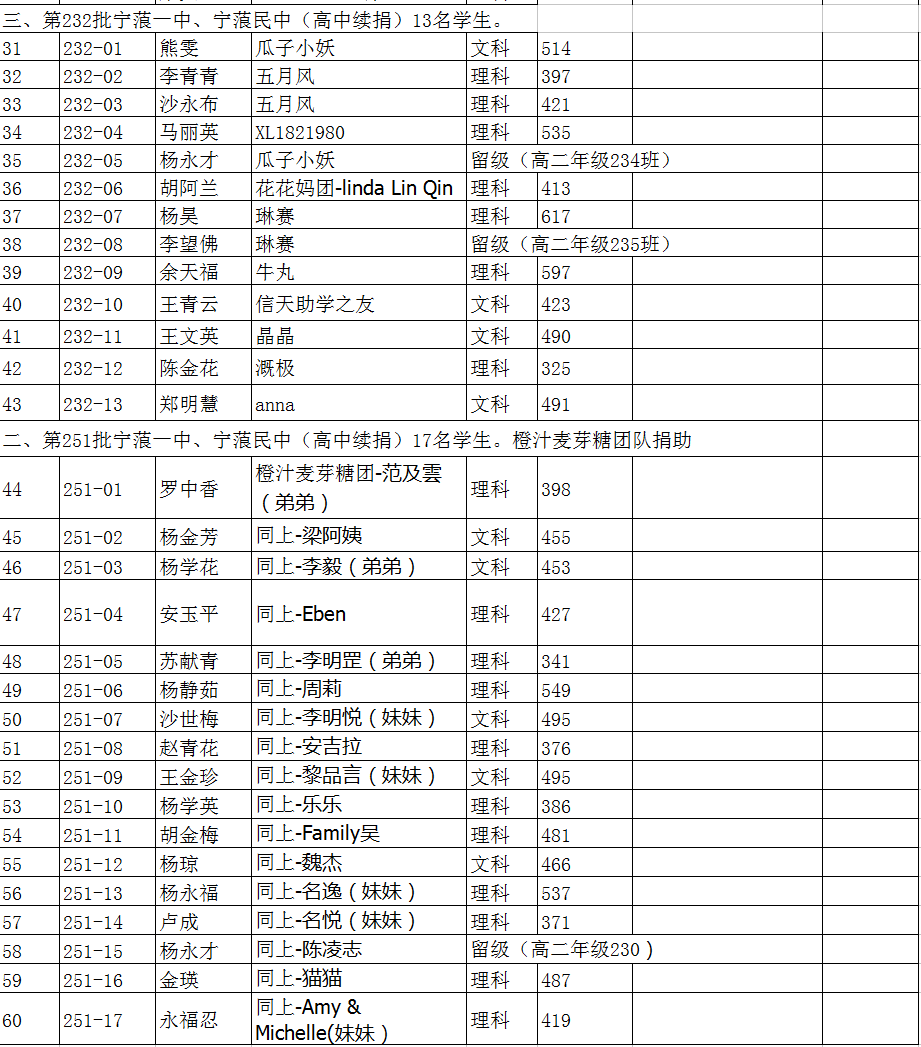 今年高中毕业的有216批、231批、232批、251批(特殊:该批次是从2017年9份(高二)开始捐助)共4批,总人数60名学生参加高考。