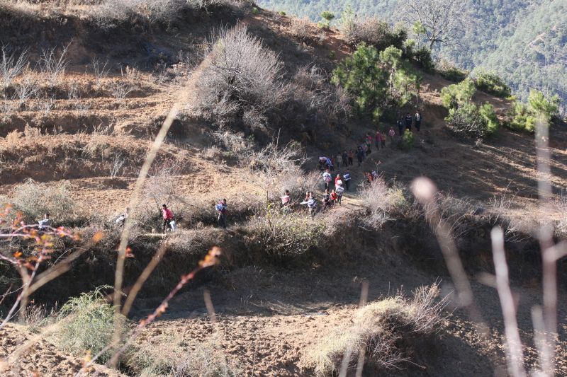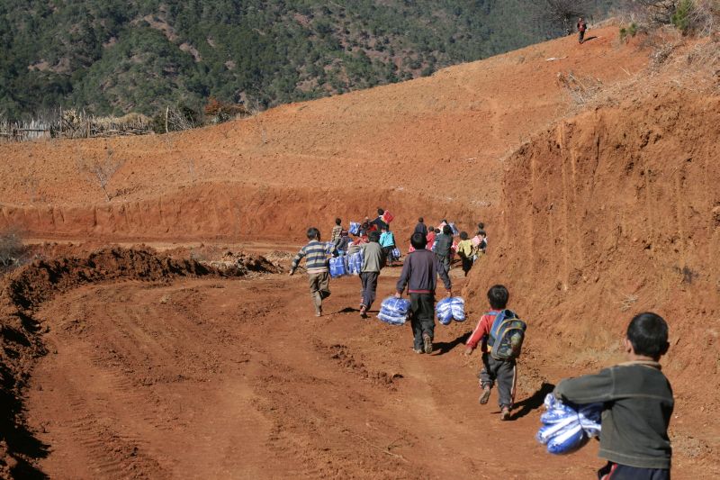 : [义教老师Sissi分发捐助衣服后,孩子们在山路上奔跑]