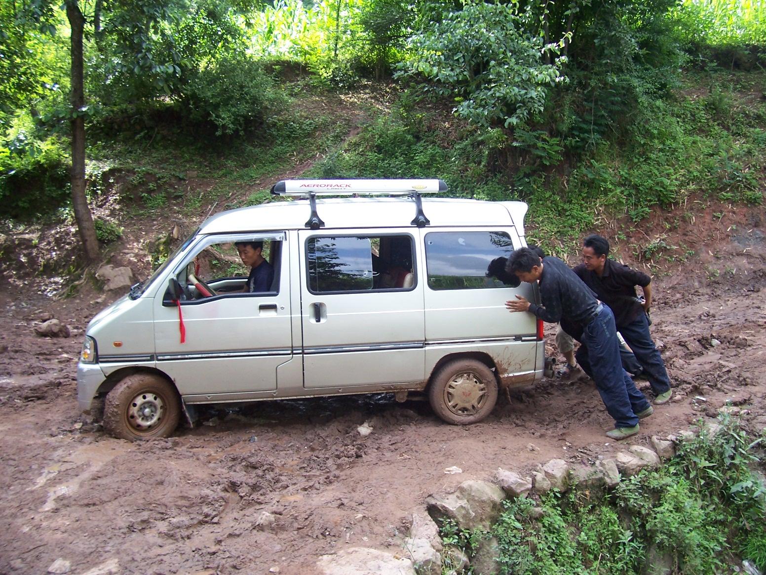 过了典补乡就是一段这样的路,车子不断地打滑、陷住,得人下去推,几十米的路段竟用掉我们近20分钟,打滑的车轮甩出泥水,大家的身上都溅满了泥点子……
