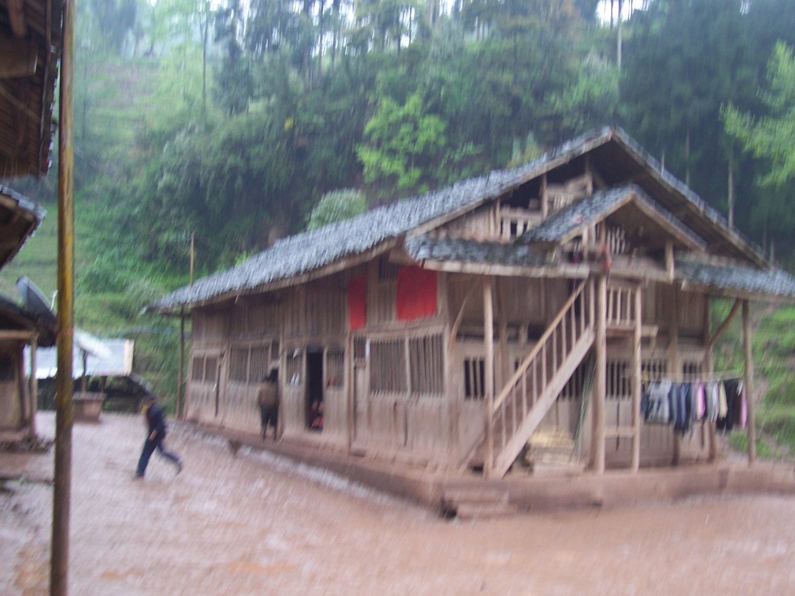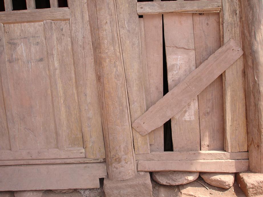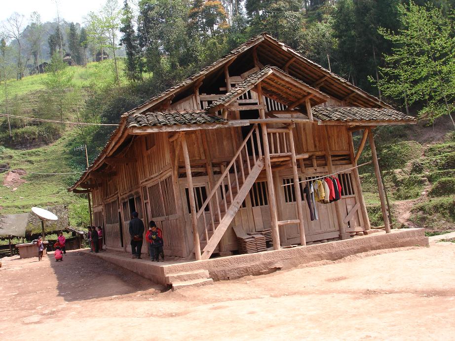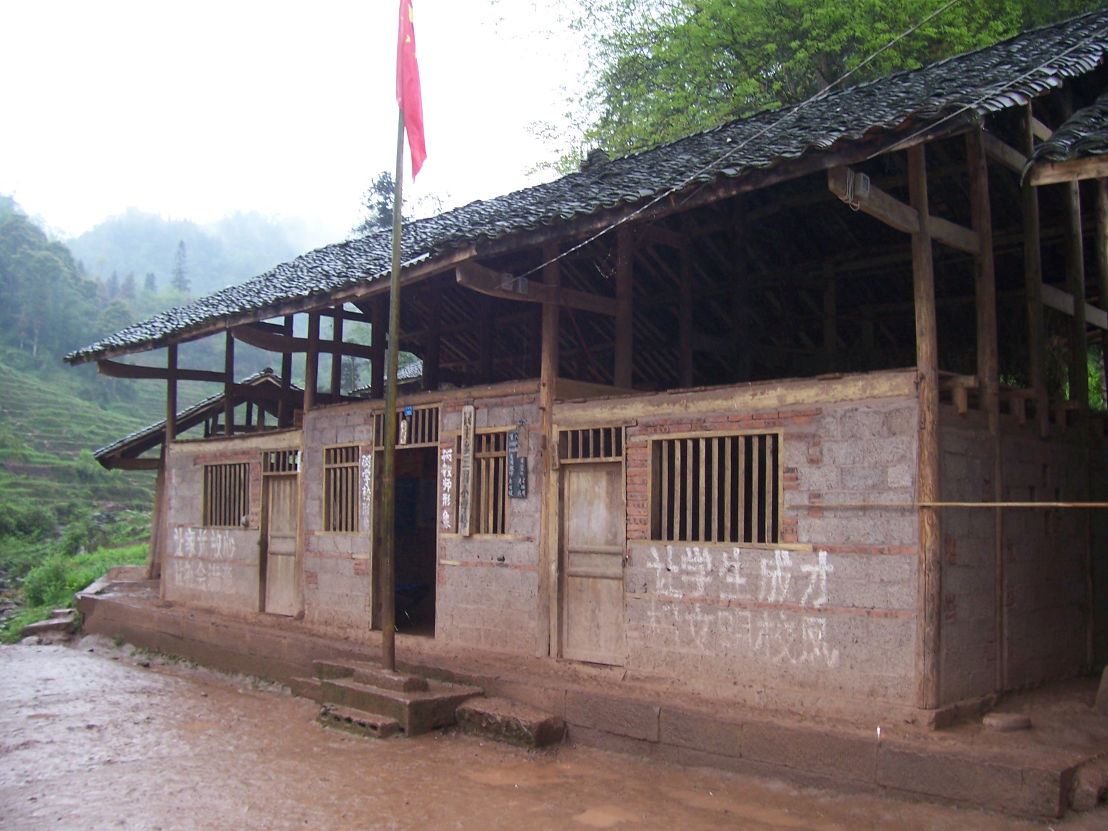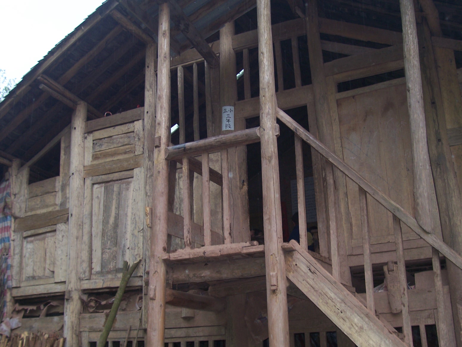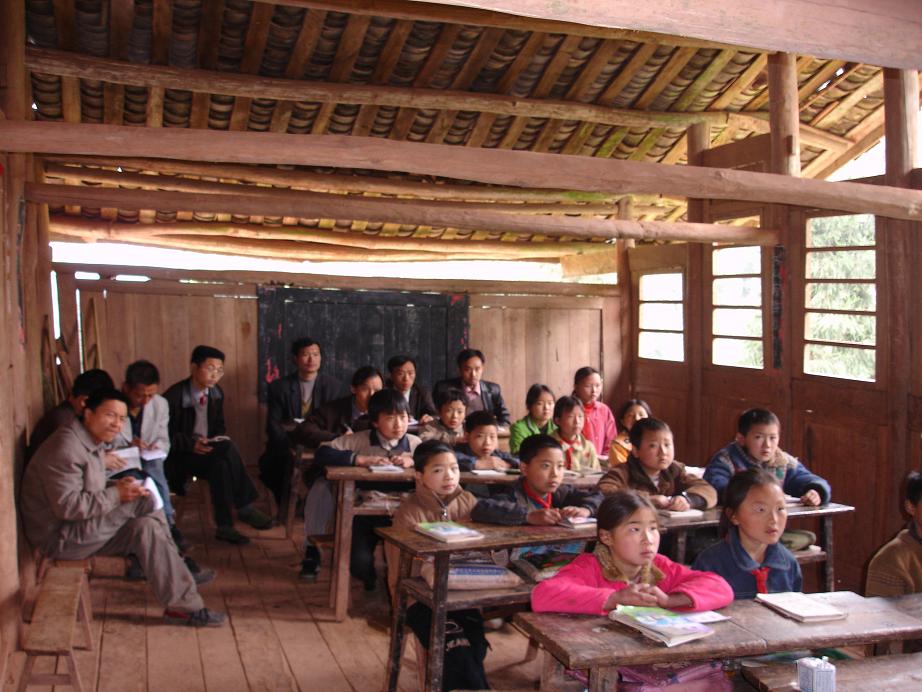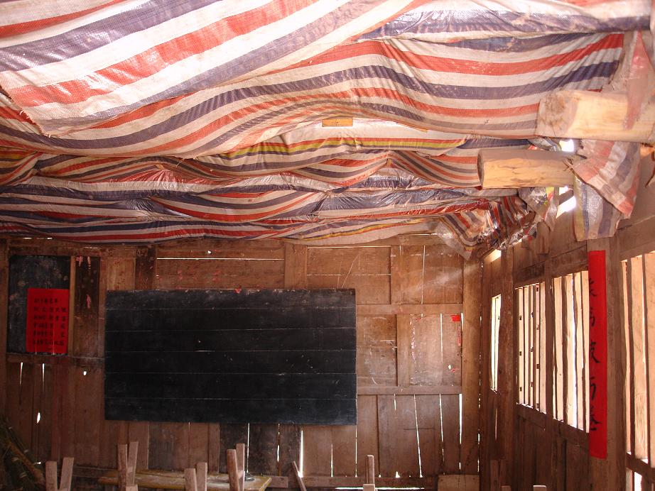 学校有两座木结构房子,其中一座年久失修,已经是危房,需要重新建设;另一座稍好些,是用砖围护的还算结实,可以继续使用,是三间,2间作教室,一间作办公室;