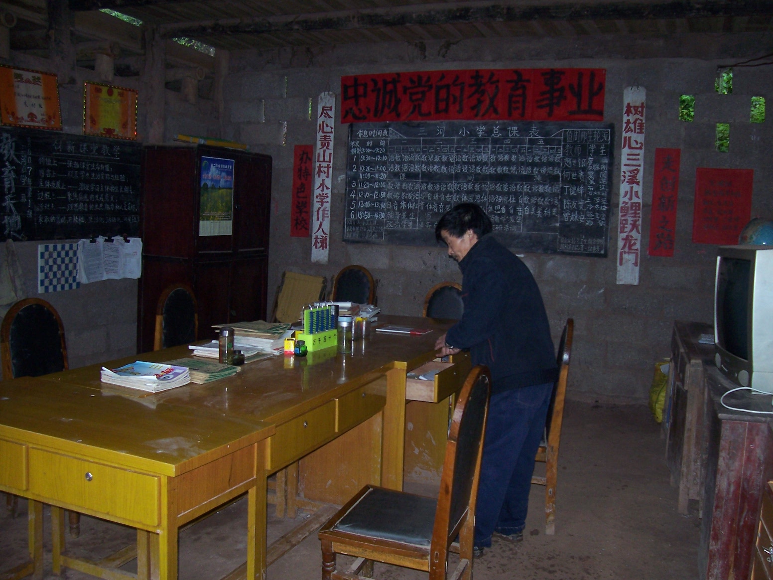 三河小学目前有100个学生,5个教师(其中2个代课教师——当地叫临聘教师,他们现在的待遇是每月300+50元)。也是1-5年级共5个班级。生源地是本村的5个村民组和属于屏山县的3个村民组,人口1000多,有150多户。