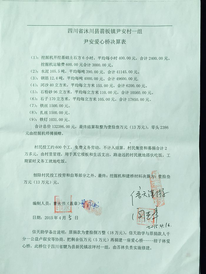 (1)此桥2014年4月竣工,2015年2月,信天和捐款人卢叙安一起回访尹安大桥,2015年4月最终结算。