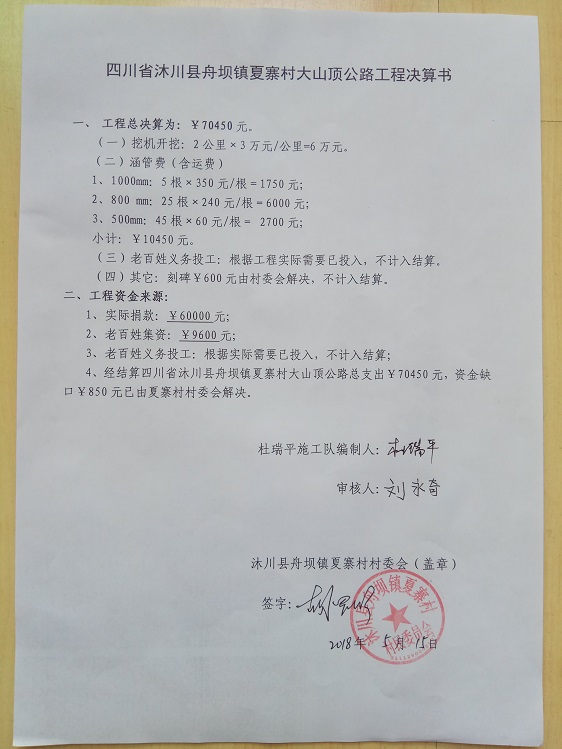 以上合计总价:¥70450元,老百姓集资¥9600元,尚有资金缺口¥60850元。