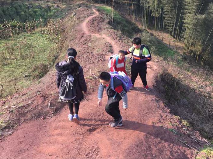 小学生上学之路,等修好了路之后,就可以坐拖拉机上学了,或者骑自行车上学了