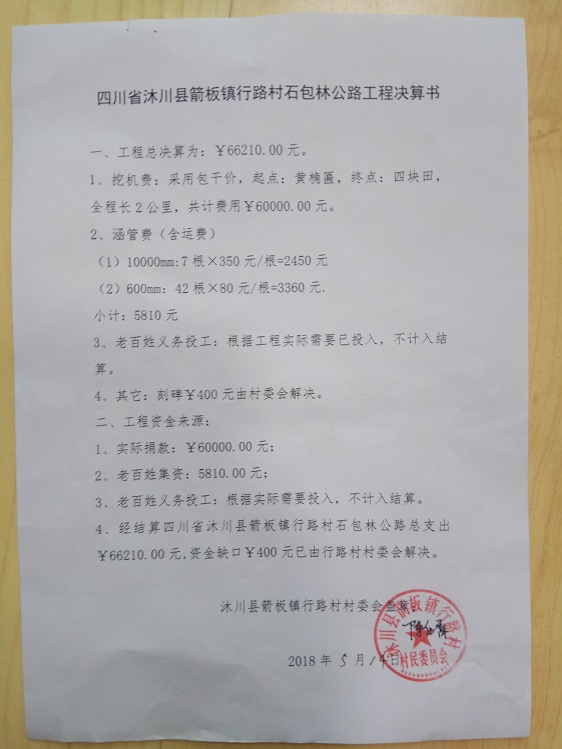 以上合计总价65810元,老百姓集资5810元,尚有60000元资金缺口。