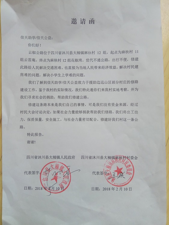 云椒公路位于四川省沐川县大楠镇麻秧村十二组,此路的起点为麻秧村十一组的云苔庵,此路终点为麻秧村十二组的花椒湾,全长2.5公里,直接受益12户,直接受益人数50人,间接受益人数约200人(周边的老百姓也走此路)。老百姓共集资了4080元。修建此路能解决小学生上学困难、解决老百姓经济作物运输困难,也为老百姓医疗救急提供了快急通道。