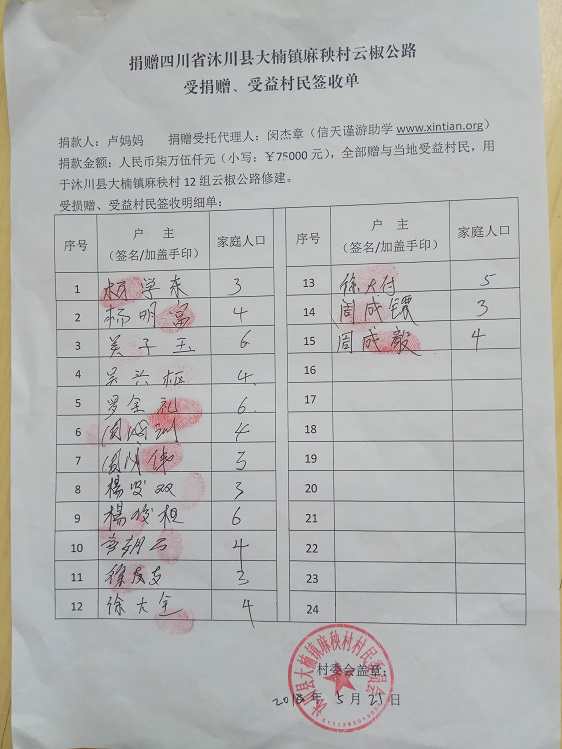 信天与卢总商量,决定追加捐款修建此堡坎。经协商:补充捐款3万元,前期预算7.5万元,前后一共捐款是105000元。受益村民签字是75000元,没有算上后来补充的3万元,特此说明。