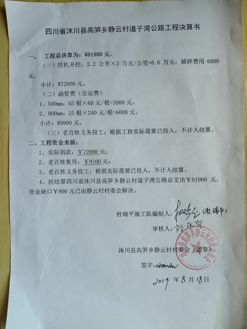 (5)修路预算分好几部分,有挖掘机、涵管、炸药爆破(山崖需要爆破)、堡坎、村民义务工、征地等。修路,我们不全包,我们出一大部分钱:挖掘费用、山崖爆破等。村民出义务工、涵管、征地费、村民小额集资。