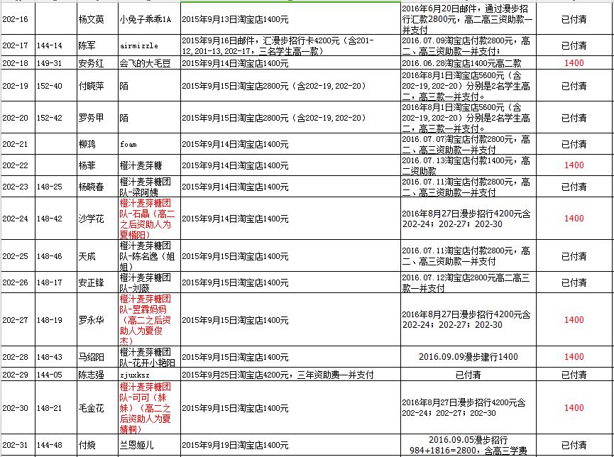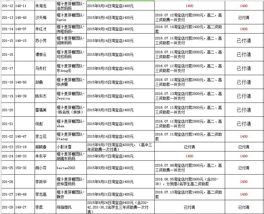 (1)201-12朱海龙,资助人:橙汁麦芽糖团队-黄志敏,支付高二、高三款2800元。