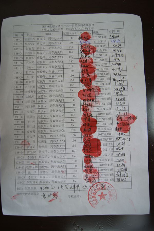 第138批马边第一初中(2015年3月-2015年7月)信天助学发款签收单:
