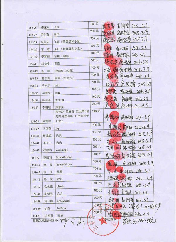 第154批宁蒗民族中学(2015年3月-2015年8月)受助学生签字确认单: