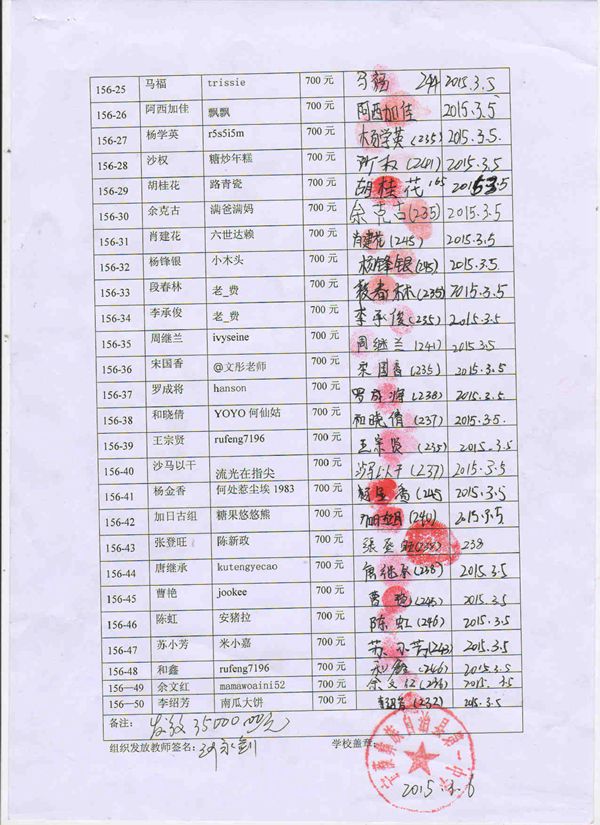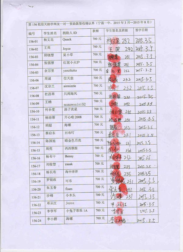 第156批宁蒗一中(2015年3月-2015年8月)受助生签收单