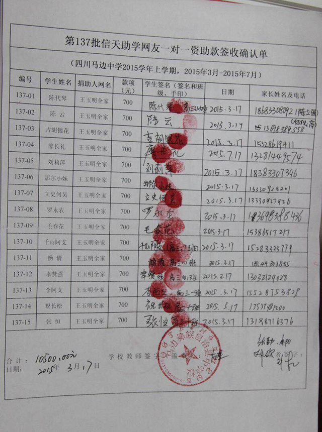 第137批马边一中(2015.03--2015.07)受助学生签收单: