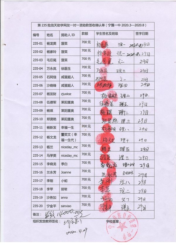 第235批宁蒗一中(2020年3月-2020年8月)受助学生签字确认单