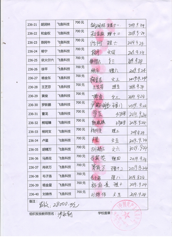 第236批宁蒗一中(2019年3月-2019年8月)受助生签收单