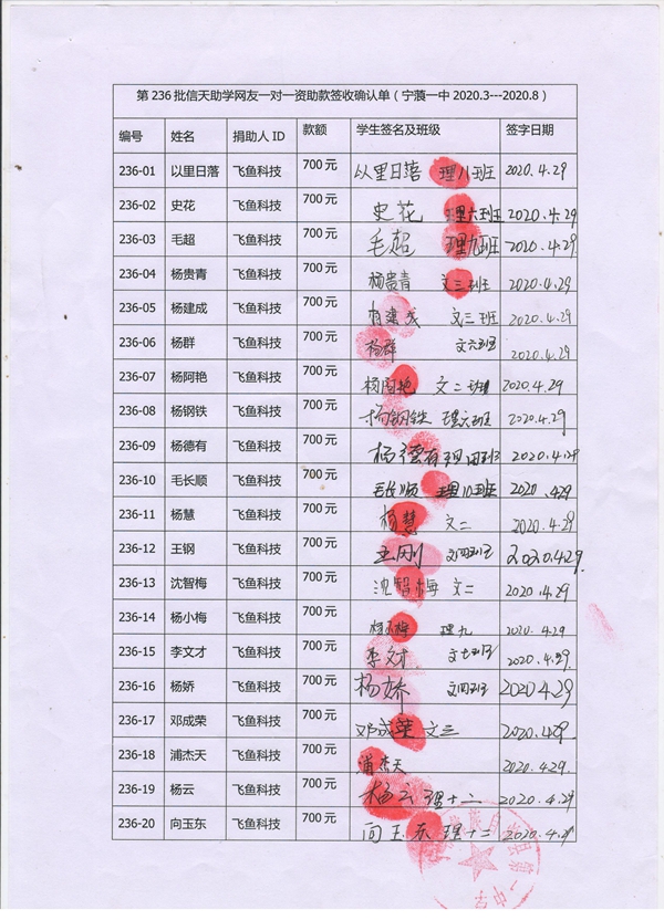 第236批宁蒗一中(2020年3月-2020年8月)受助学生签字确认单