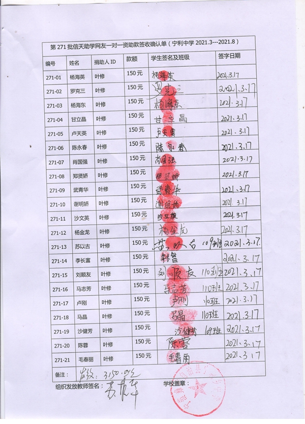 第271批宁利中学(2021年3月到2021年8月)受助学生签收单