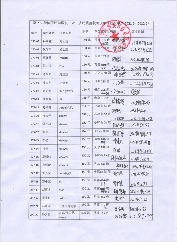 第277批红旗中学(2021年9月-2022年2月)受助学生签收确认单
