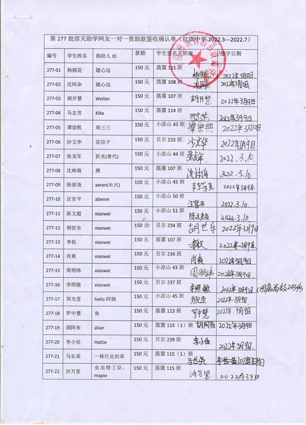 第277批红旗中学(2022年3月-2022年7月)受助学生签收确认单