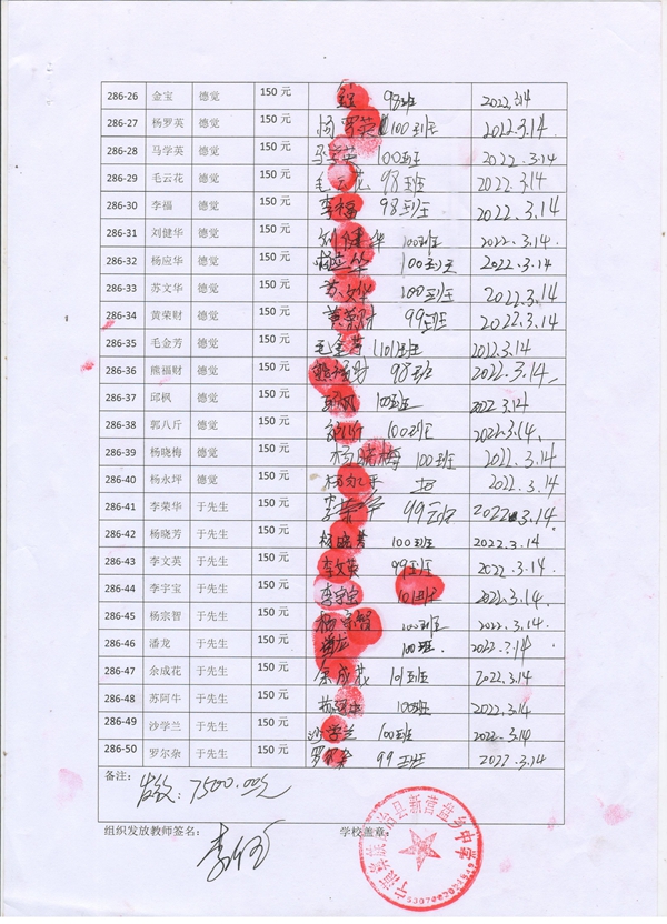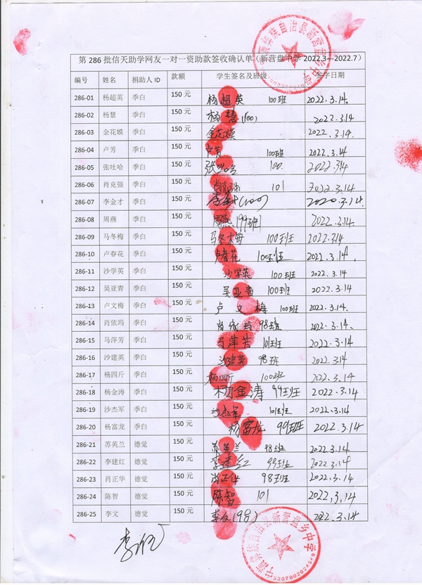 第286批新营盘中学(2022年3月到2022年7月)受助学生签收单