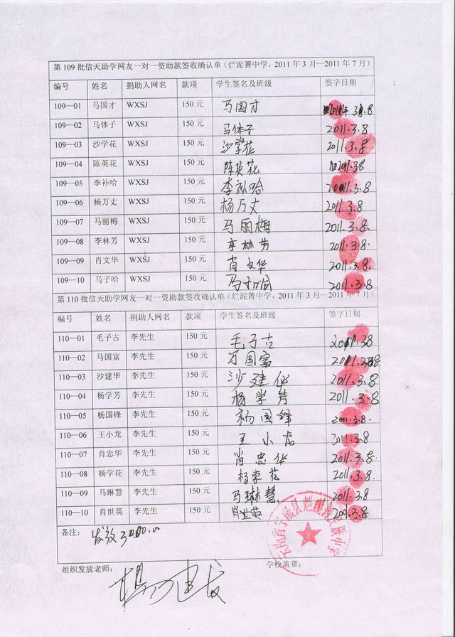 我们将收取全部六个学期的资助款,每学期初汇给委托老师浦理智老师,由浦理智老师按学期组织向受助学生发放资助费,最后我们统一在网上公布受助生领款签收单。