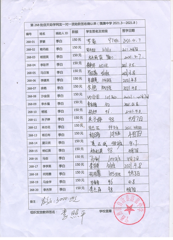 第268批蒗渠中学(2021年3月-2021年8月)受助学生签字确认单