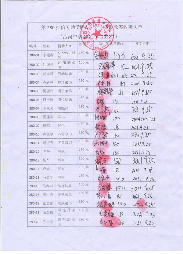 第280批战河中学(2021年9月-2022年2月)受助学生签字确认单
