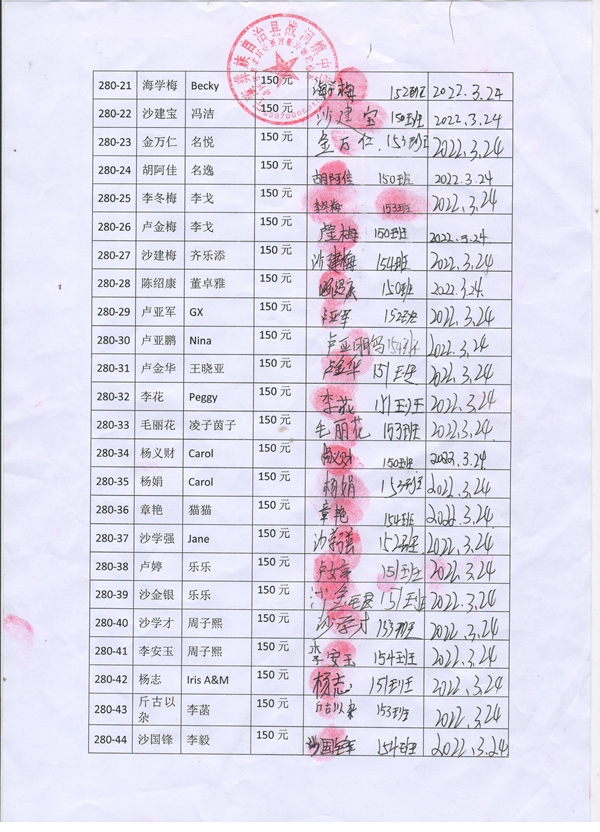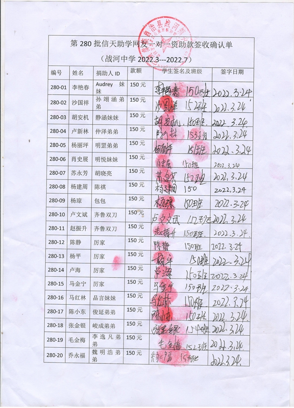 第280批战河中学(2022年3月-2022年7月)受助学生签字确认单