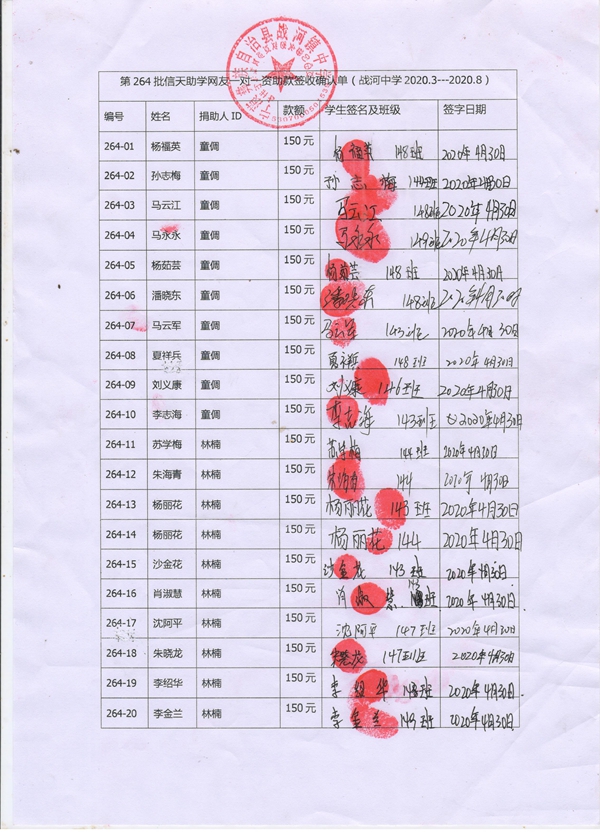 264-26李庆,因中途转学,资助款转给李金花;