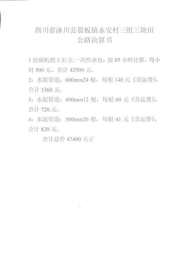 至此2011年5月3日:三块田公路决算47400元终于找齐。