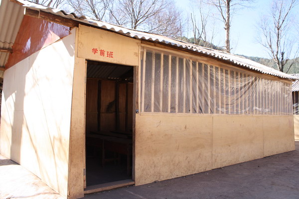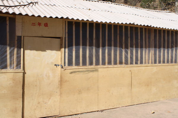 原来的简易教室由于漏雨,三合板太薄,已经拆了,现在在老学校外面空地上用厚木板加固了新的简易教室。