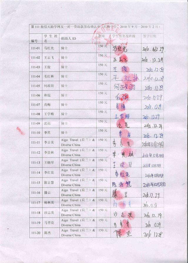 (备注:“Tiger”组织捐助20名,但是后因某些原因取消了原计划资助20名学生,改为10名学生。因此111-21号至111-30号学生转由星河欲转捐助,谢谢。)