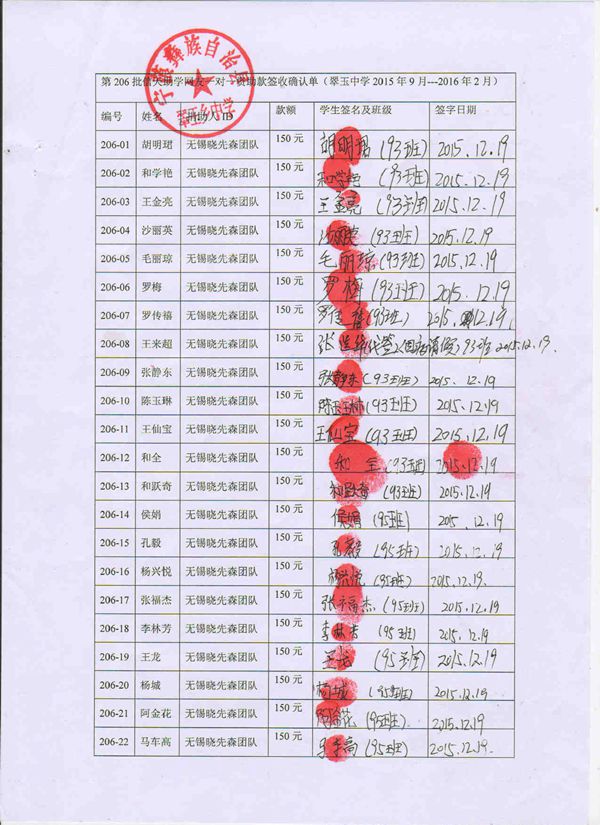 第206批翠玉中学(2015年9月-2016年2月)受助学生签字确认单