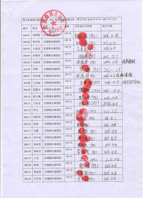 第206批翠玉中学(2016年3月-2016年7月)受助生签收单