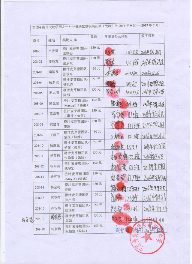 第208批战河中学(2016年9月-2017年2月)受助学生签字确认单