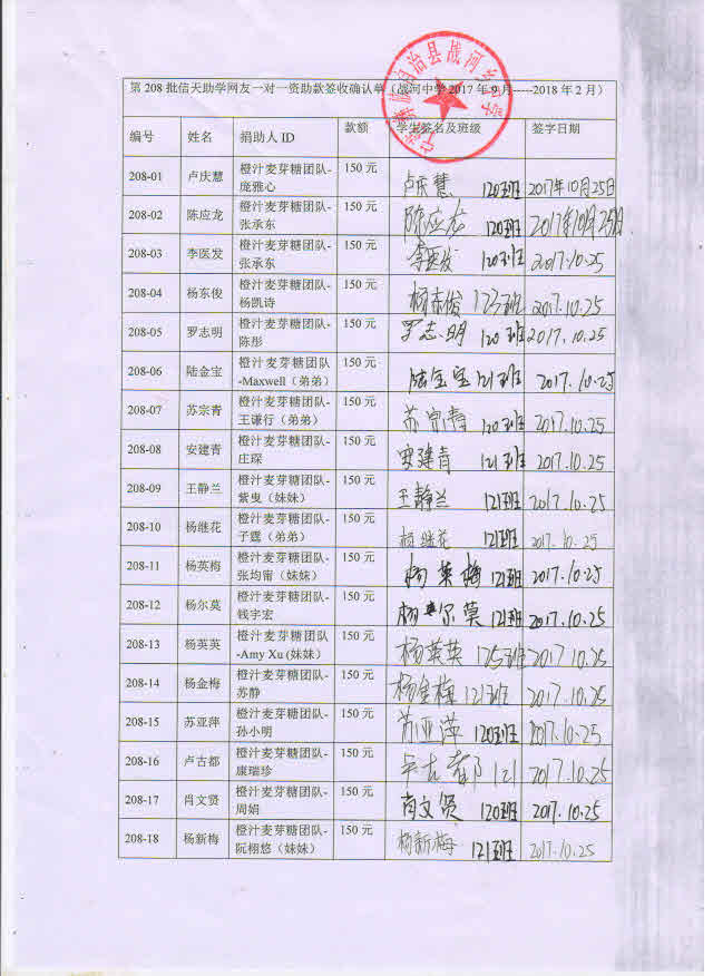第208批战河中学(2017年9月-2018年2月)受助学生签字确认单