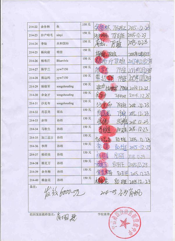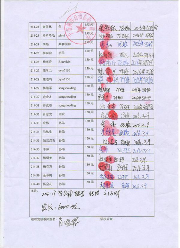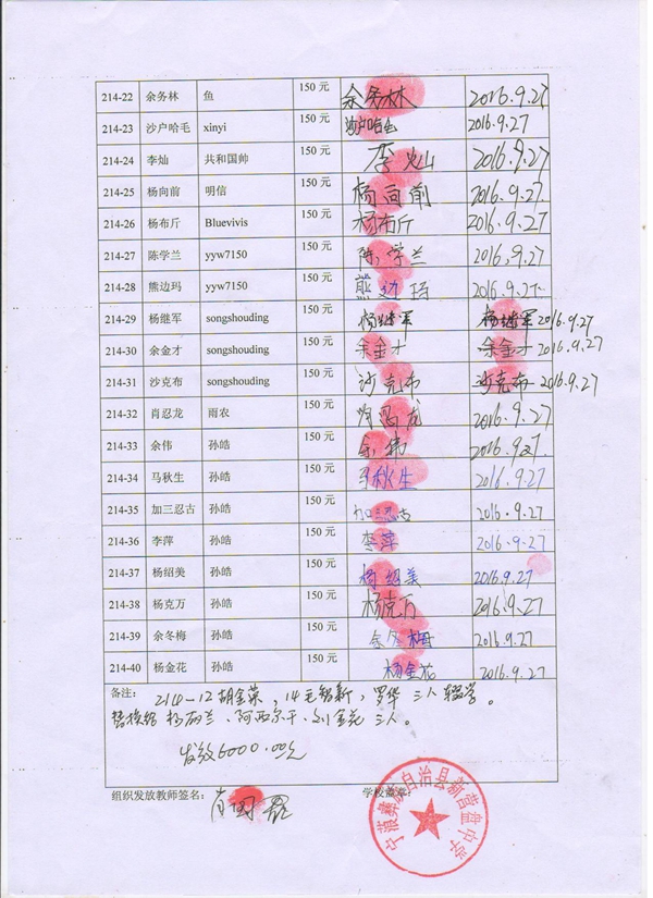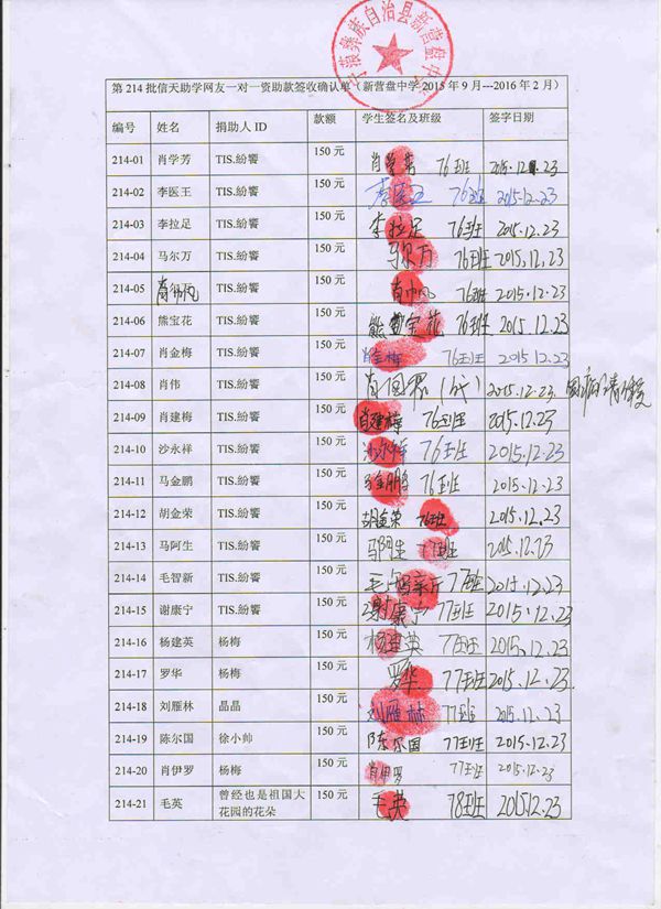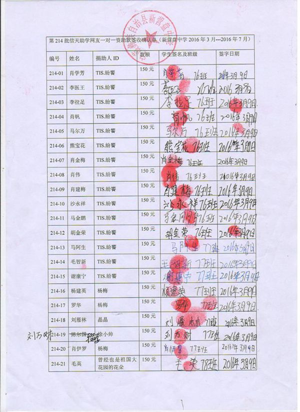 第214批新营盘中学(2016.03-2016.07)受助学生签收单