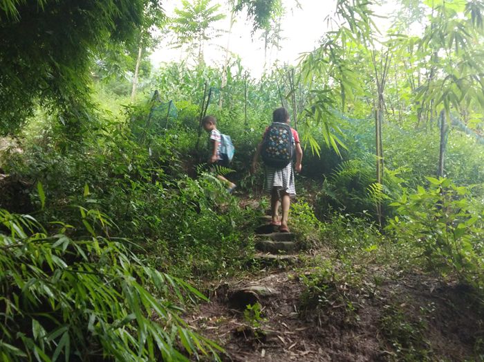 小学生上学之路,等修好了路之后,就可以坐拖拉机、面包车上学了,或者骑自行车上学了。