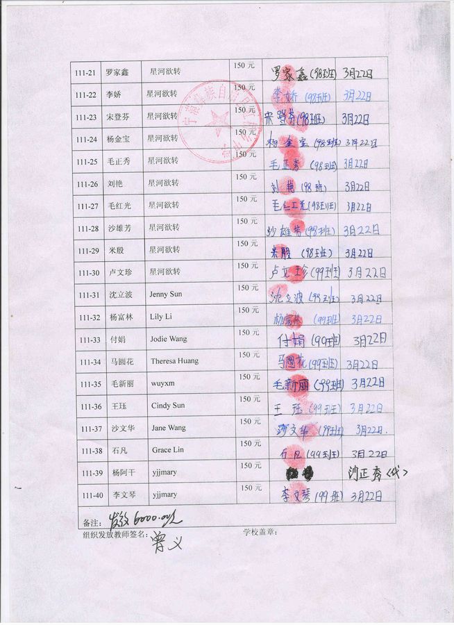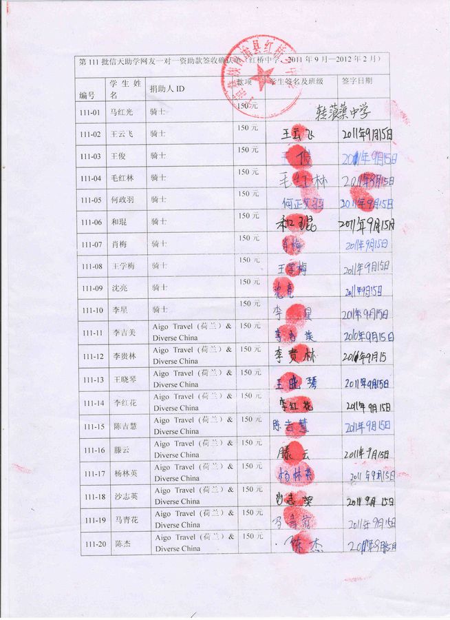 (备注:“Tiger”组织捐助20名,但是后因某些原因取消了原计划资助20名学生,改为10名学生。因此111-21号至111-30号学生转由星河欲转捐助,谢谢。)